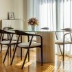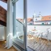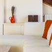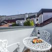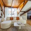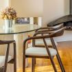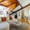 - Zona living: un ampio open space dominato dalla luce naturale, con travi in legno che creano un’atmosfera calda e sofisticata. Il divano confortevole invita al relax, la smart TV, mentre il tavolo da pranzo in vetro è perfetto per cene eleganti. Dal living si accede a un terrazzino privato arredato, dove gustare un caffè o un calice di vino osservando la quiete del cortile interno.