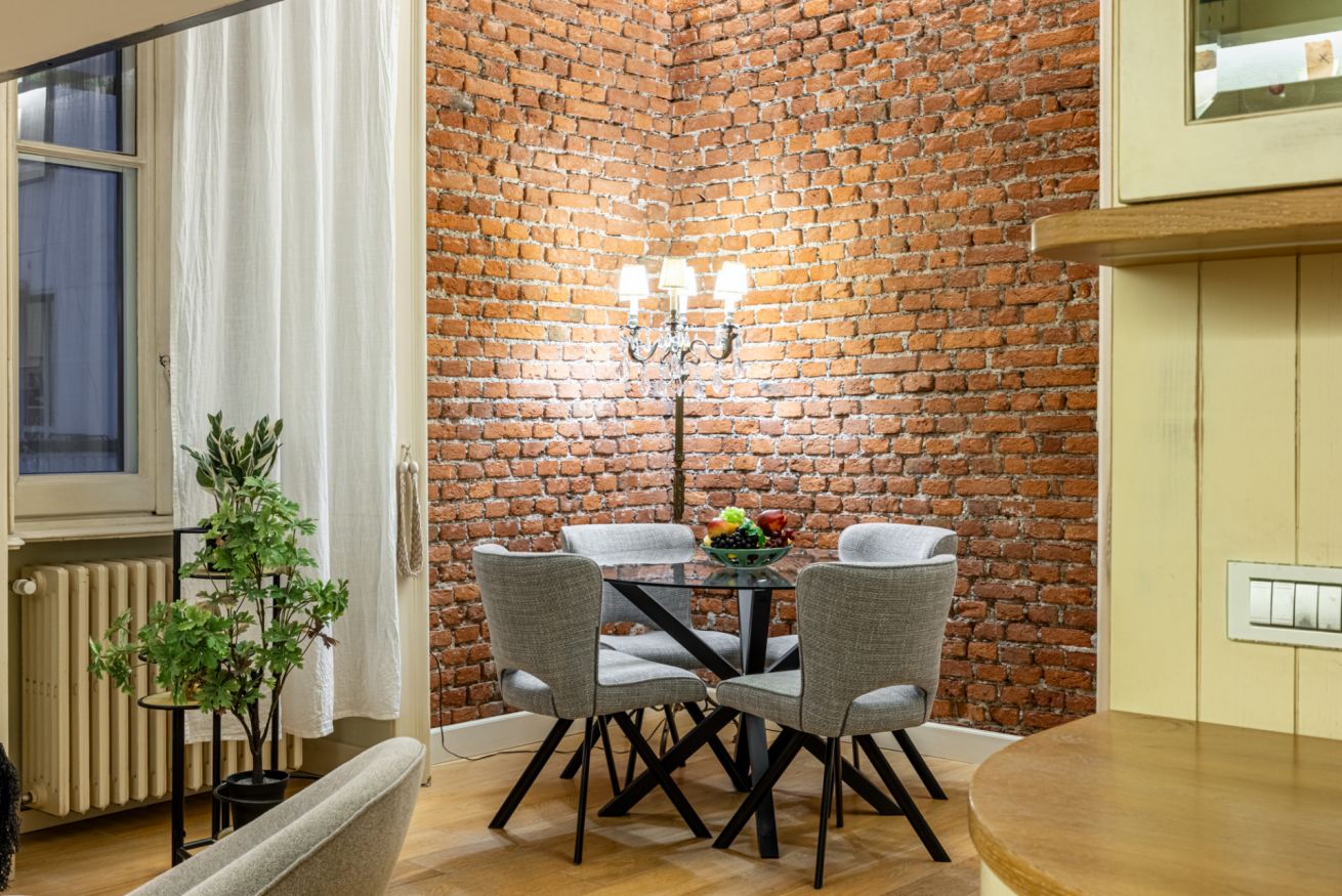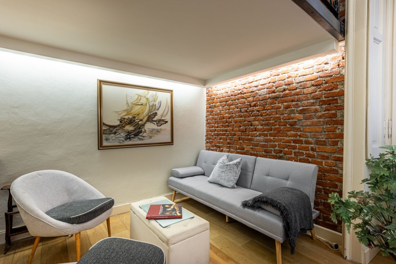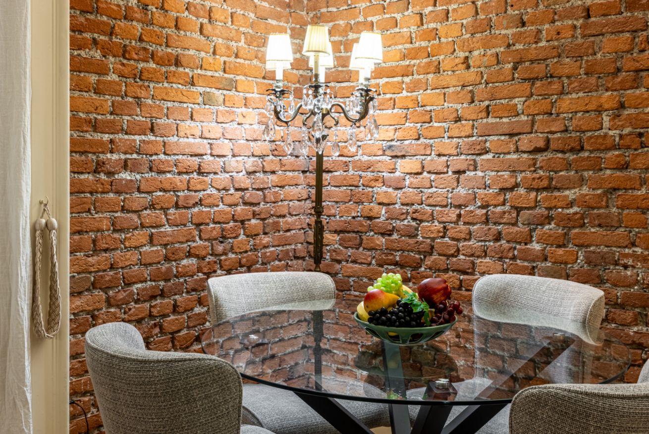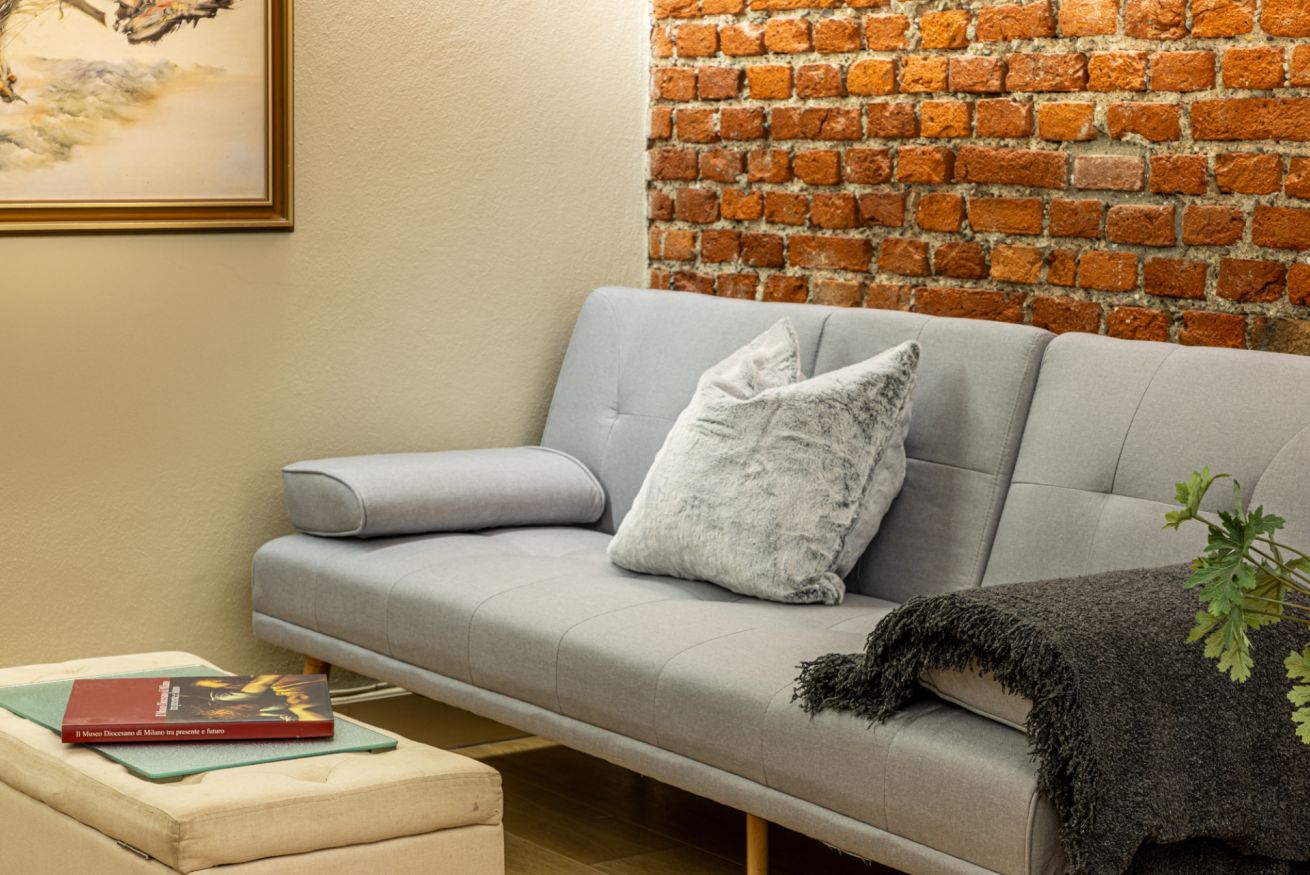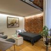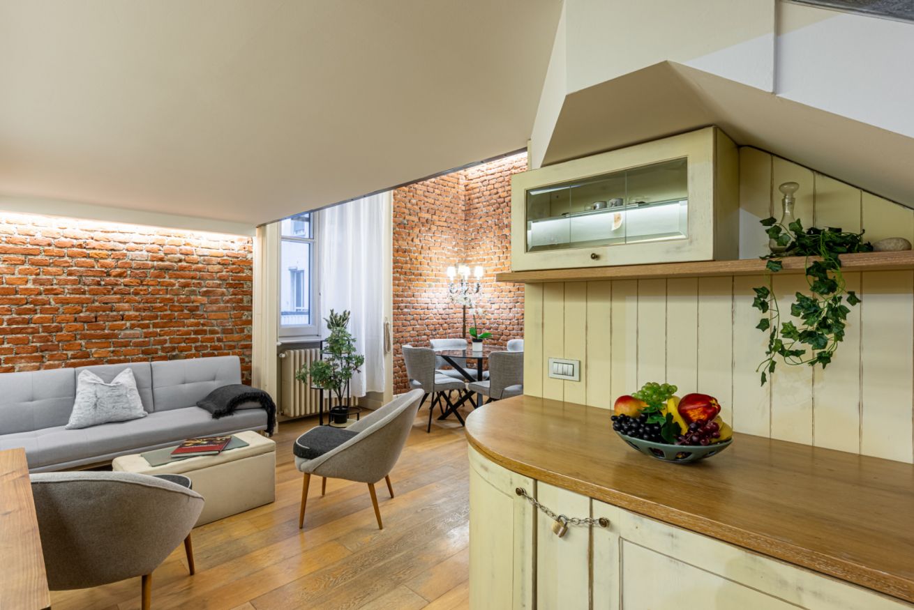 Il soggiorno è uno degli ambienti più scenografici della casa: un open space ampio, con soffitti alti e pareti in mattoni rossi a vista che creano un’atmosfera loft elegante e autentica.