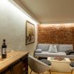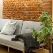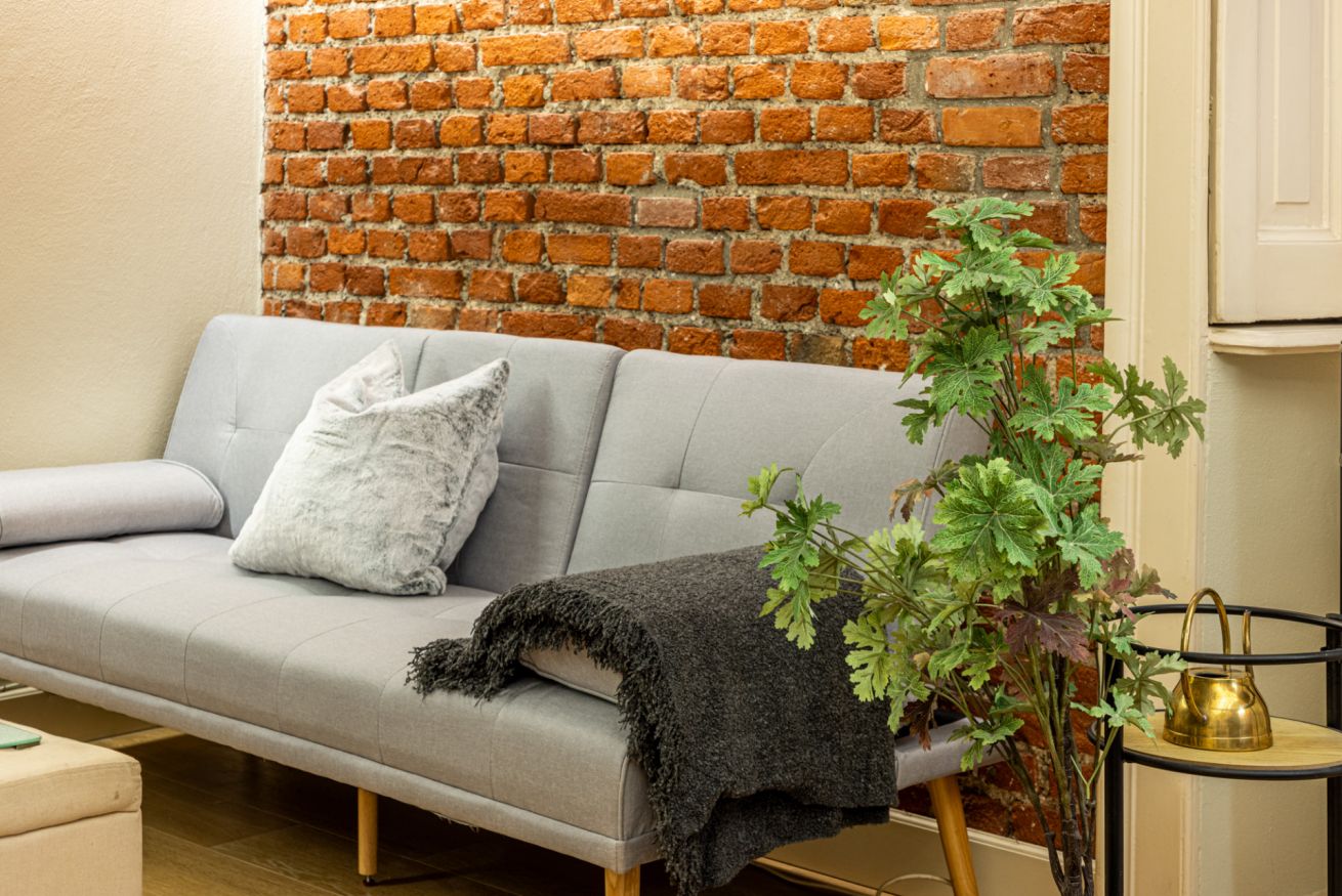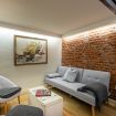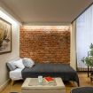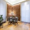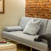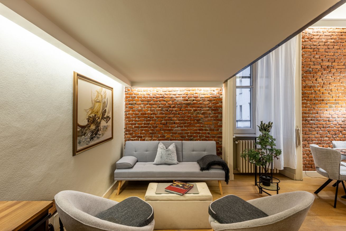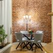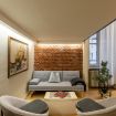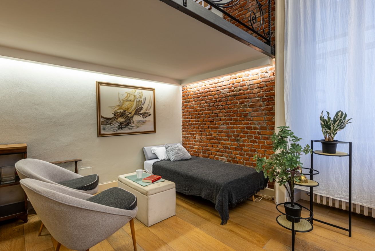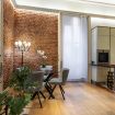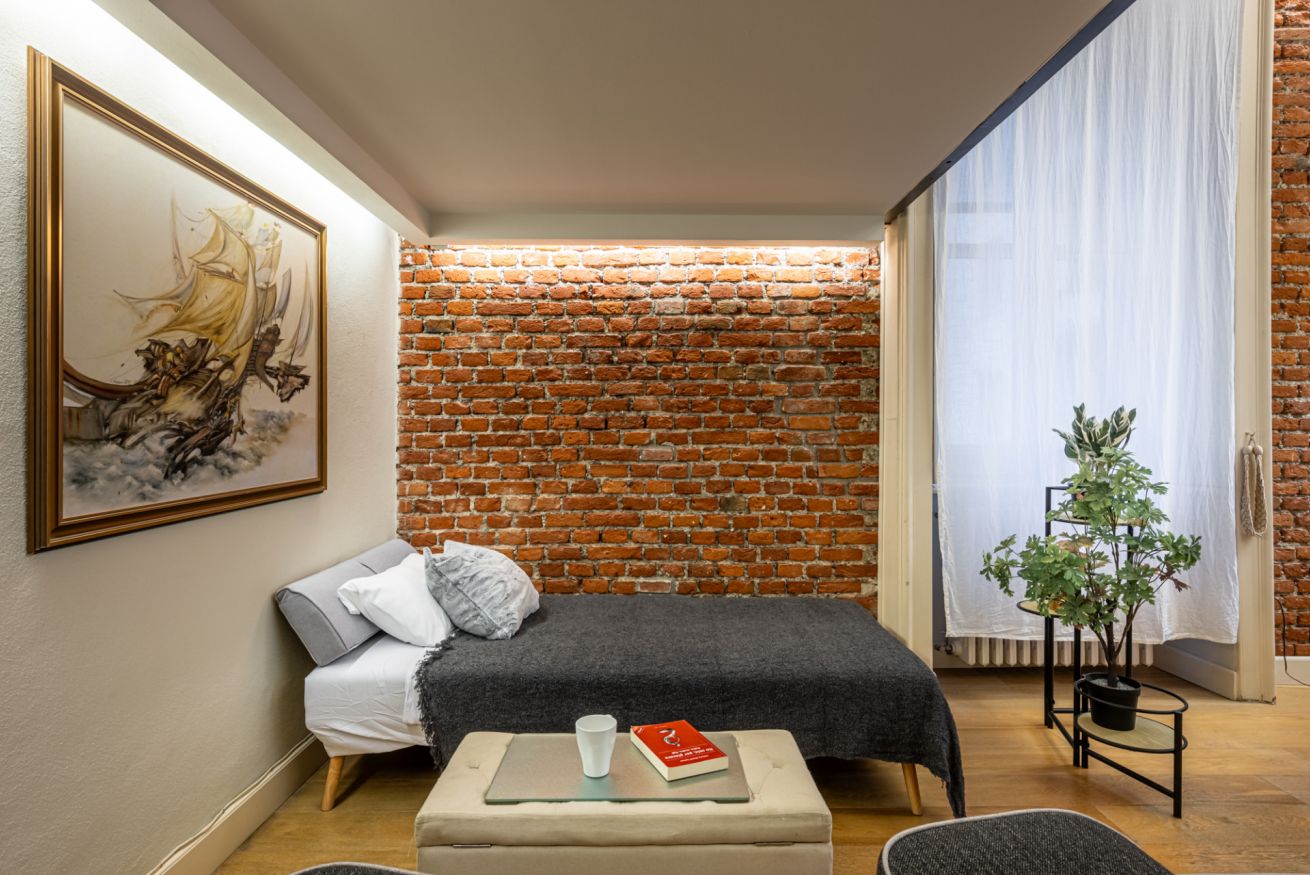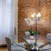 Il soggiorno è uno degli ambienti più scenografici della casa: un open space ampio, con soffitti alti e pareti in mattoni rossi a vista che creano un’atmosfera loft elegante e autentica.