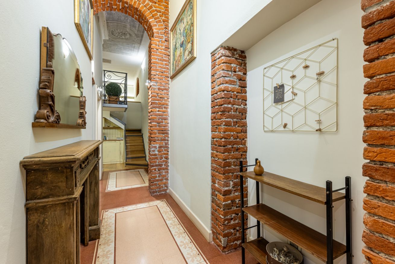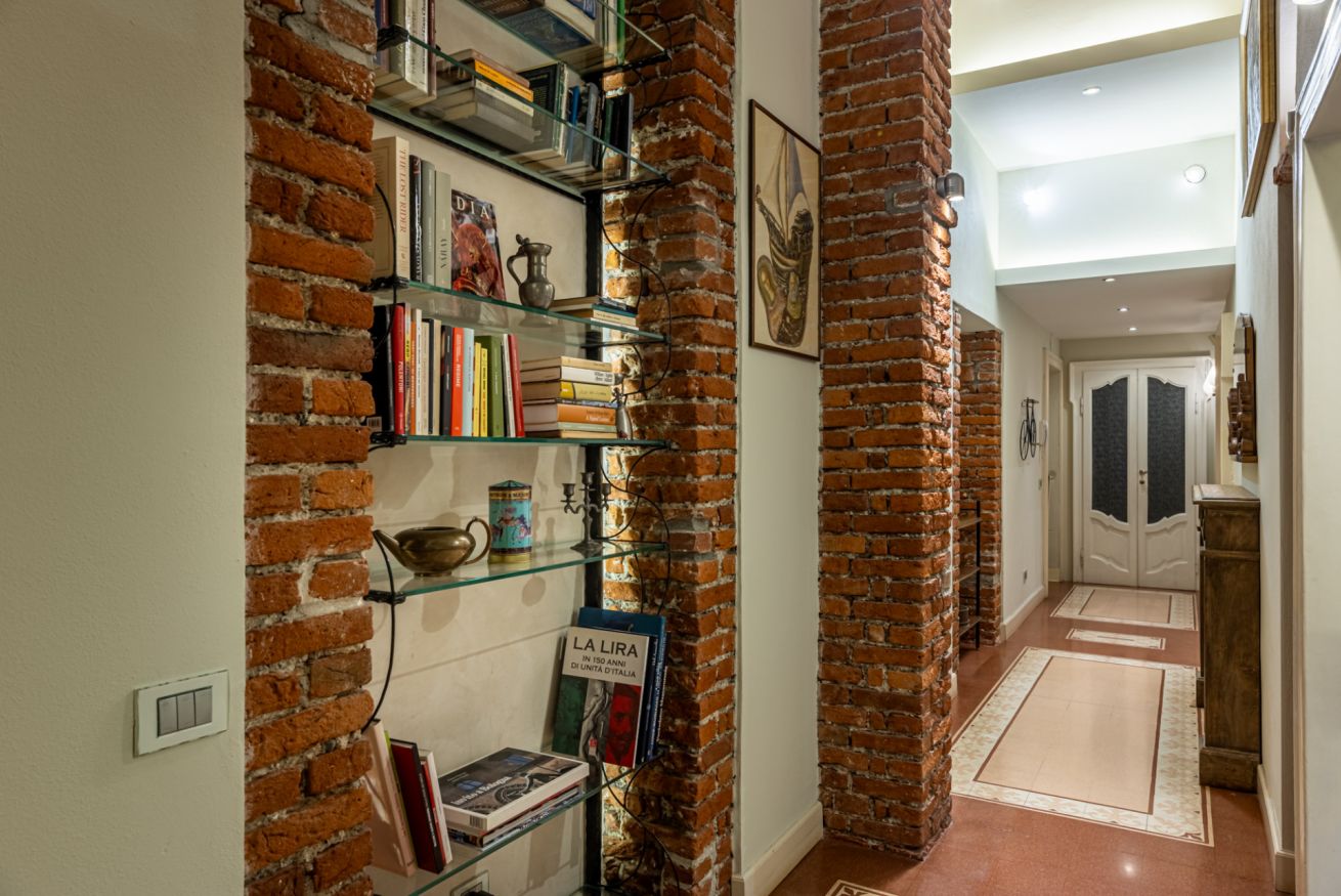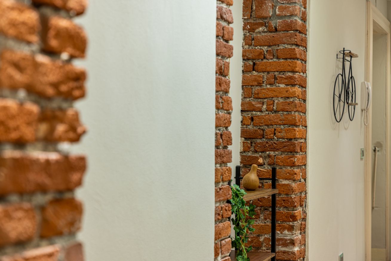 Appena entri vieni accolto da un lungo corridoio elegante, ricco di quadri e decorazioni artistiche, con dettagli vintage e splendidi mattoni rossi a vista che creano subito un’atmosfera calda e sofisticata.