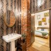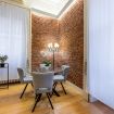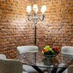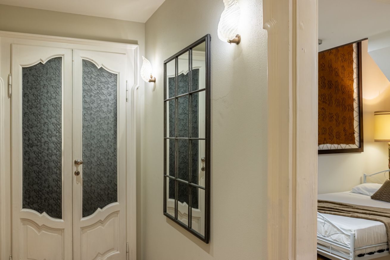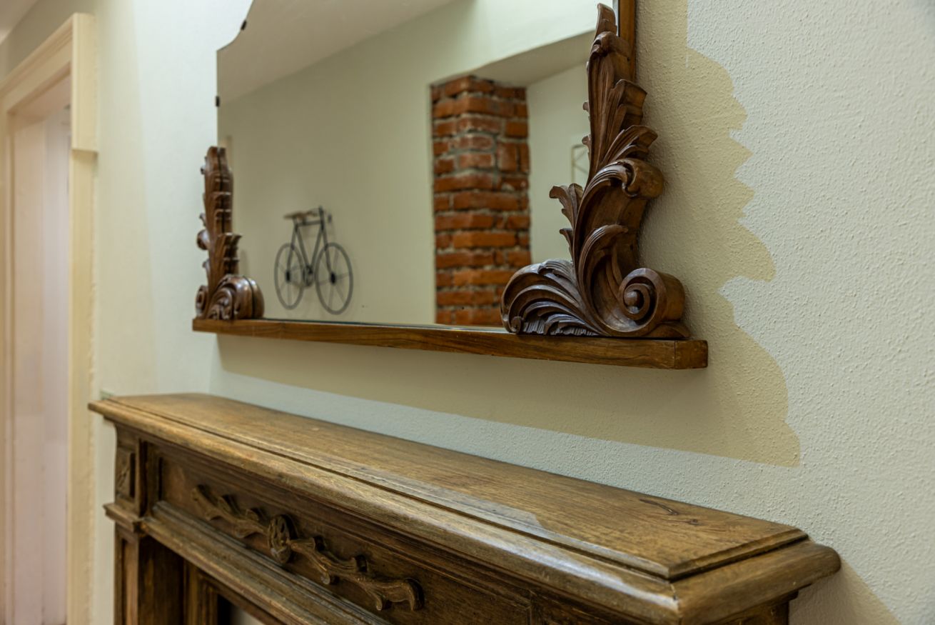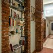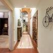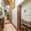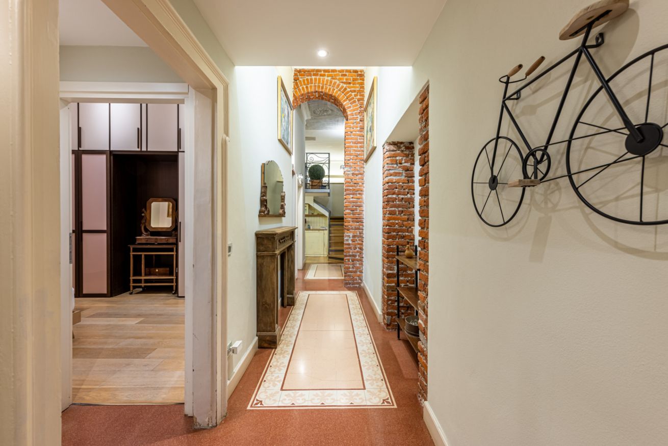 Appena entri vieni accolto da un lungo corridoio elegante, ricco di quadri e decorazioni artistiche, con dettagli vintage e splendidi mattoni rossi a vista che creano subito un’atmosfera calda e sofisticata.