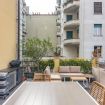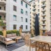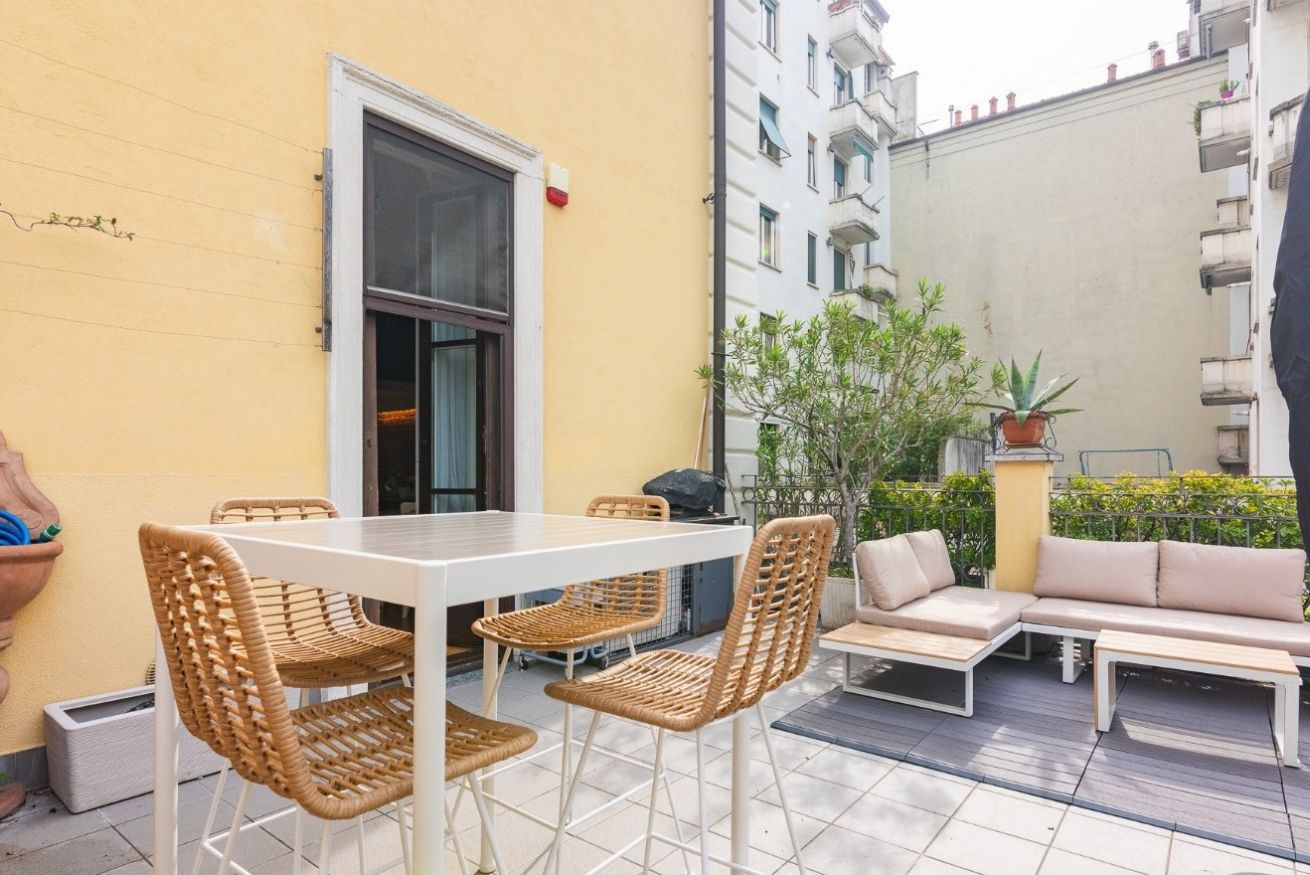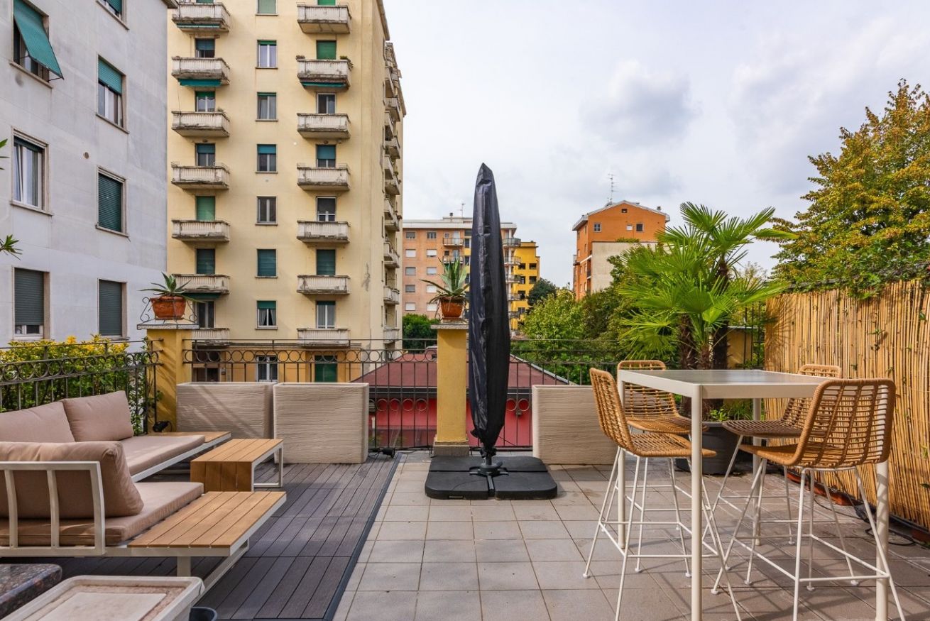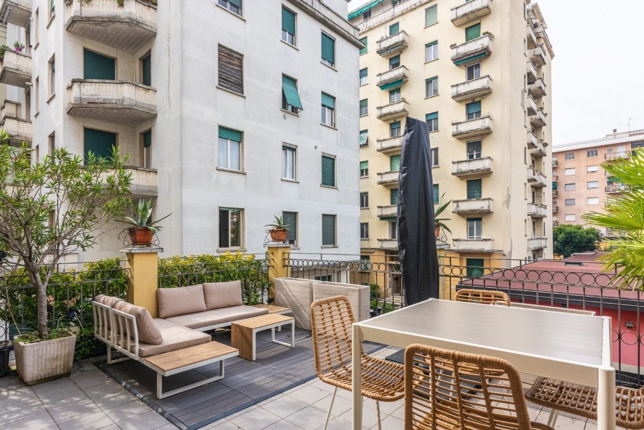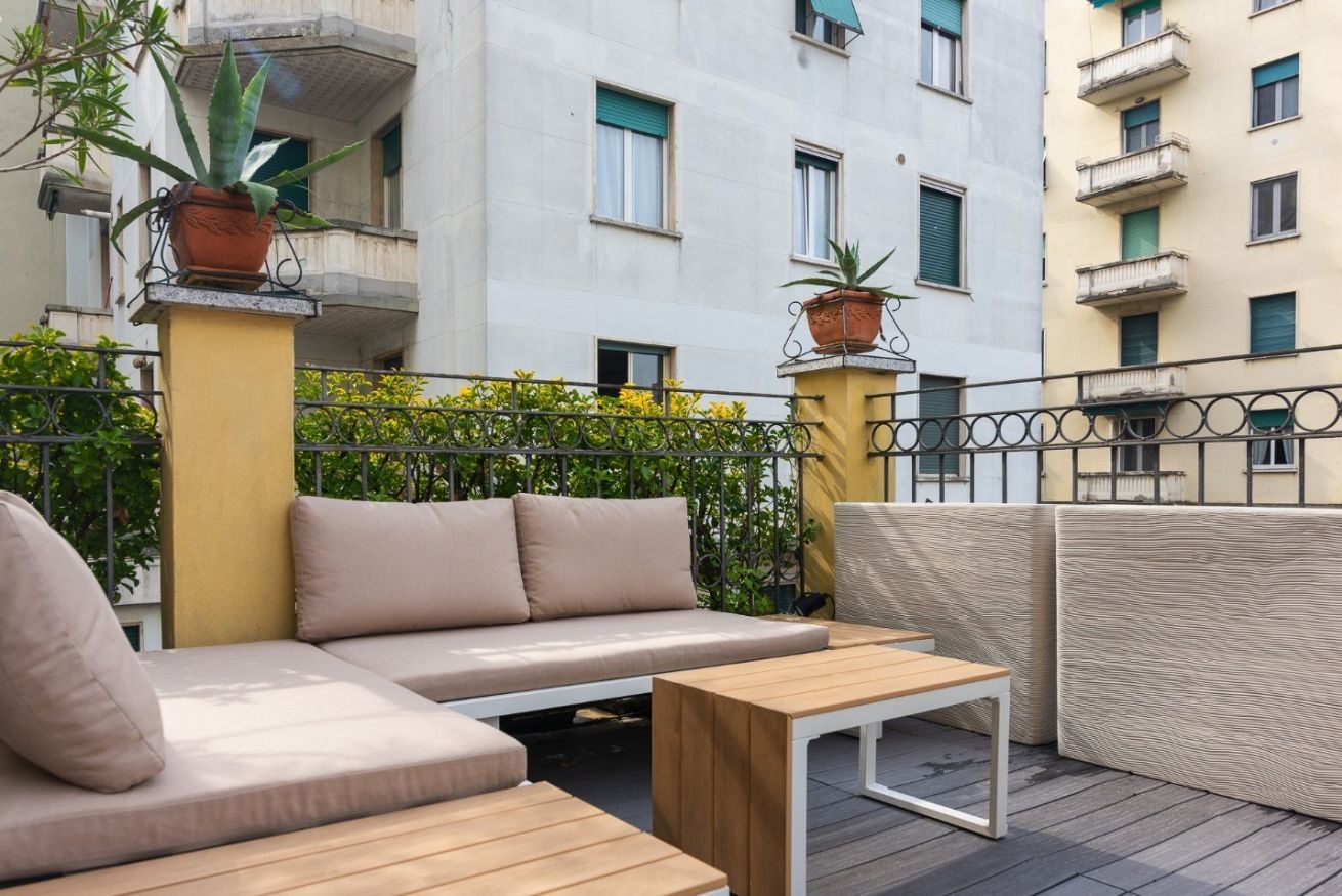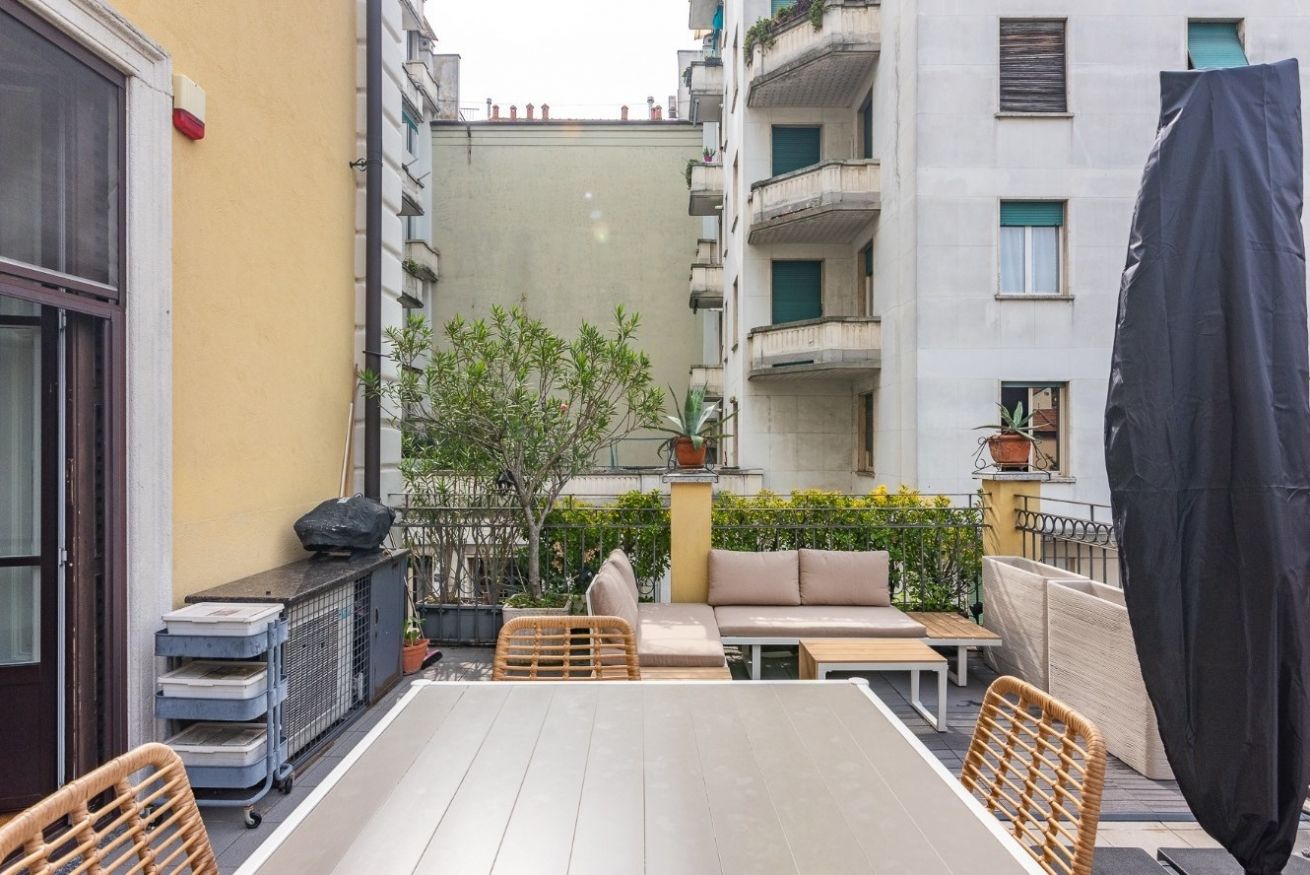 Dal soggiorno si accede direttamente al terrazzo ampio e luminoso, uno spazio raro e prezioso a Milano.