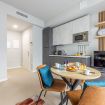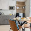 - Zona giorno: verrai accolto da un raffinato open space arredato con gusto. Le grandi finestre donano luce naturale durante tutto il giorno, mentre il comodo divano letto matrimoniale e la TV sono ideali per rilassarsi dopo una frenetica giornata in città. Il tavolo da pranzo con le sedie in similpelle si integra armoniosamente con la cucina per creare un ambiente conviviale ed elegante.