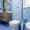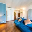 - Soggiorno open space: un luminoso spazio con tonalità di azzurro tenue, dotato di un comodo divano letto, tavolo da pranzo per quattro persone e accesso diretto alla cucina.