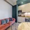 - Zona living open space: ambiente accogliente con divano letto comodo, Smart TV e arredi moderni dai colori caldi, ideale per rilassarsi dopo una giornata in città.